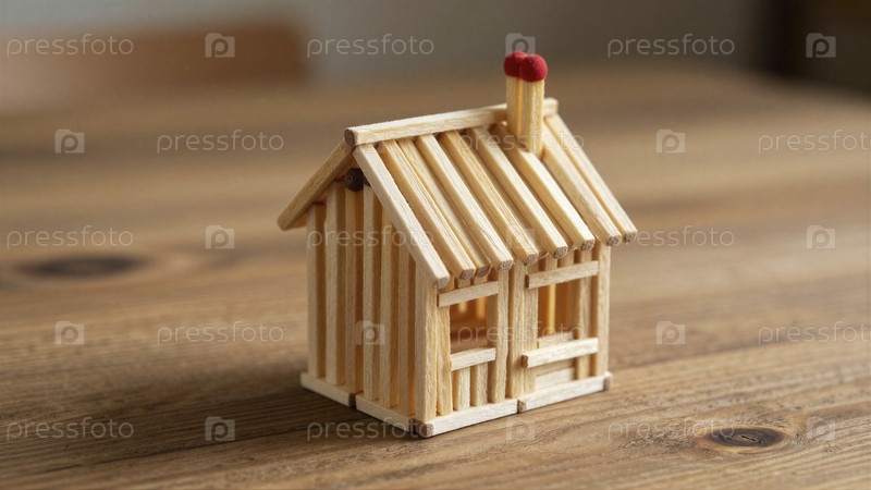 Дом из спичек, выполненный с осторожностью на деревянном столе