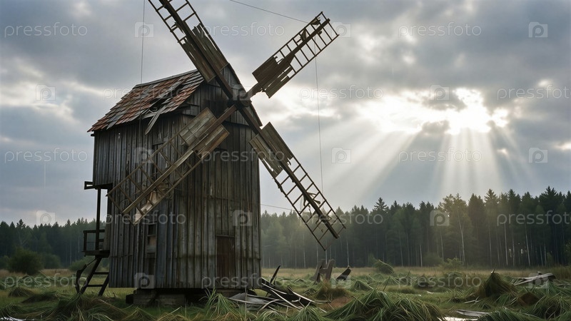Проветриваемая ветряная мельница среди лесных лучей