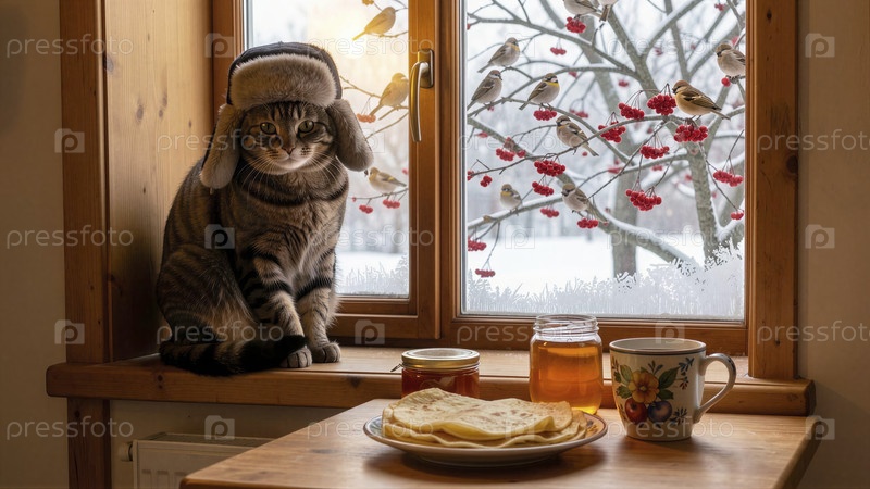 Уютная кошка наслаждается зимними угощениями на подоконнике