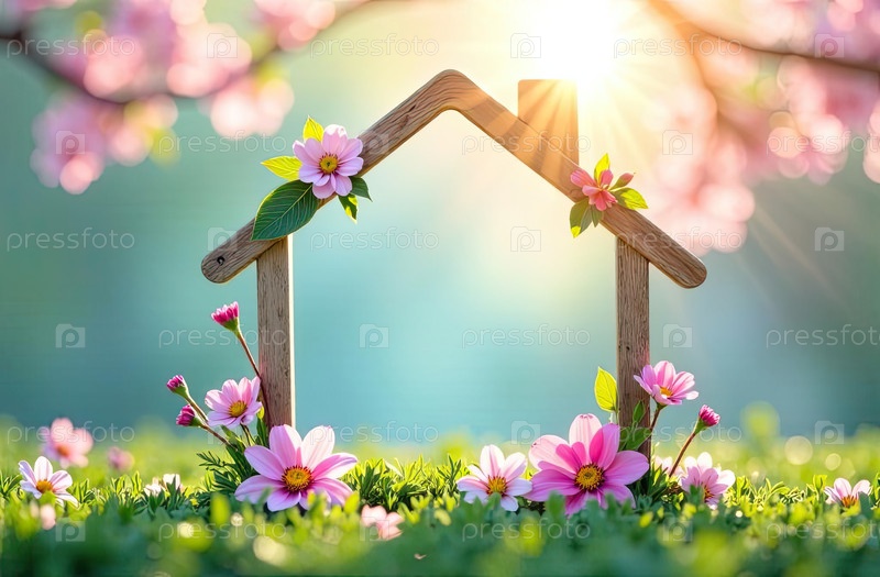 Весенние цветы рекламные рамки дома ? место для текста, ипотека, продажа, аренда, дом в цвете, приглашение