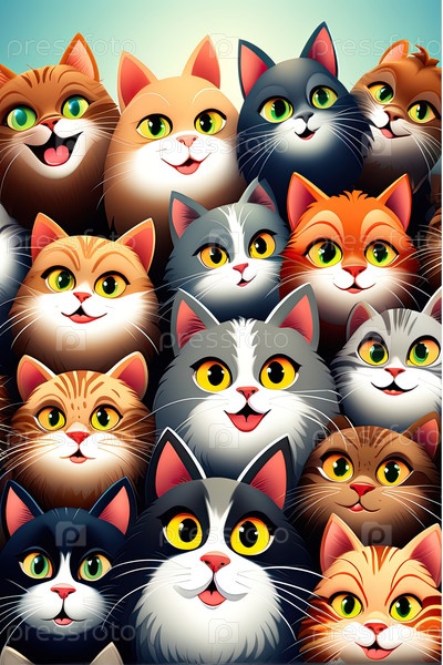 Красивый шаблон толпы кошек ? стиль мультфильма, различные породы, яркий дизайн, постельное белье, упаковочная бумага, пища для домашних животных, промо здорового ухода