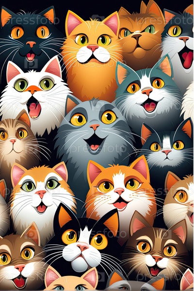 Забавный комиксовый рисунок кошачьих лиц ? Seamless repeat, оранжевые/серые/белые кошки, текстильная печать, этикетка для домашних животных, подарочная упаковка, реклама продуктов питания