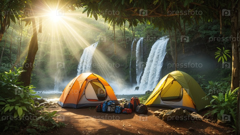 Водопад, палатки в джунглях солнечный луч - приключенческая поездка, тропическая природа, летний кемпинг, реклама экотуризма, плакат отдыха
