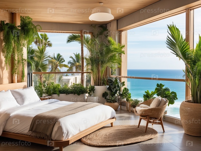 Спальня на пляже из натурального дерева, арочное окно, зеленый тропический декор - бутик-отель, современный комфорт, тихий туристический номер