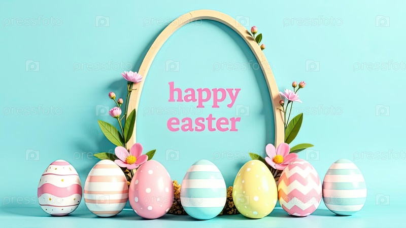 Пасхальный голубой пастельный баннер, яйца, рама с вишневыми цветами, "счастливого пасхи"; для поздравительной открытки, приглашения, место для текста