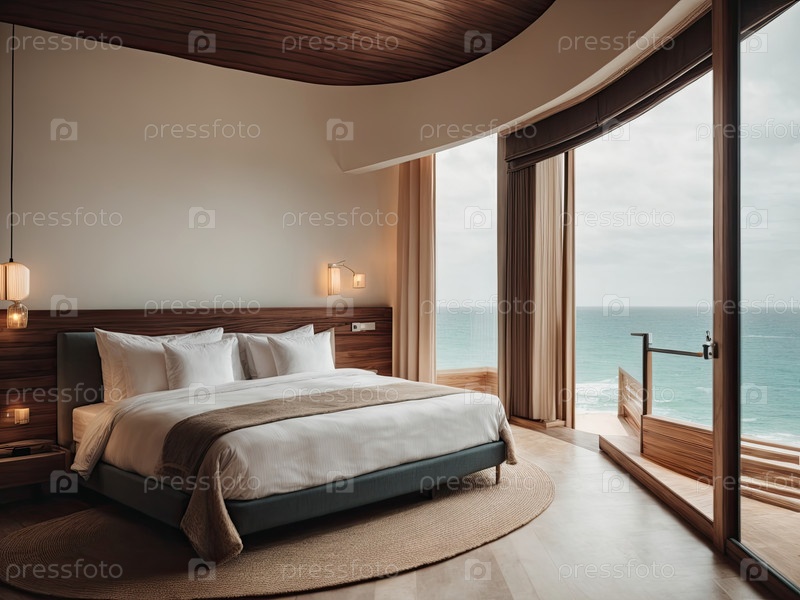 Уютная тропическая спальня с деревянными акцентами, окна от пола до потолка, аутентичный стиль путешествия - расслабляющий гостиничный номер, ощущение летнего отдыха
