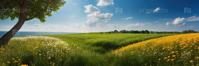 Солнечное поле, голубое небо, желтые цветы - летний табло настроения, место для текста в небе (используется для туристического плаката или календаря)