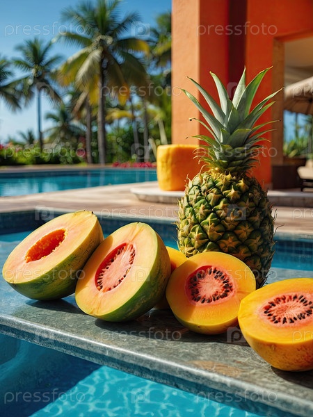 Гуава, киви, ананас, набор фруктов папайи, бассейн роскошного курорта ? фотография тропической еды, оздоровительный туризм, реклама меню, баннер блога