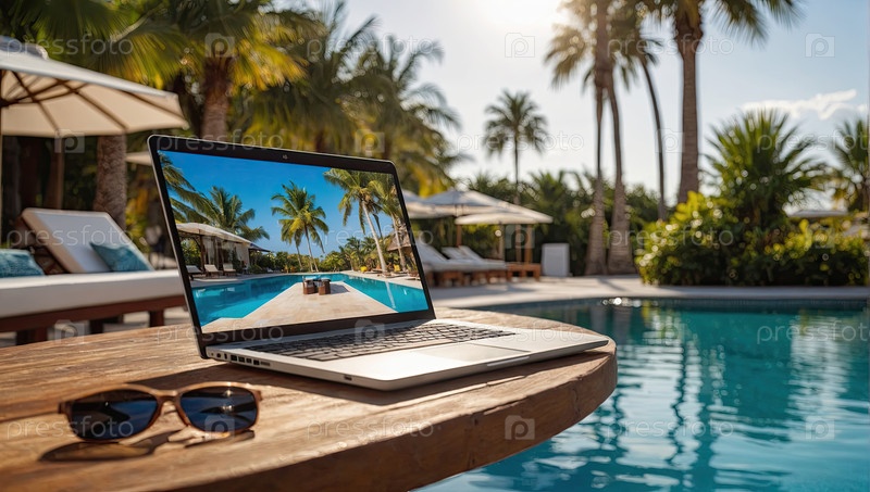 Ноутбук и ноутбук от солнечного бассейна, пальмовых теней - свободное путешествие, цифровой кочевник, работа на свободу, сильная зона Wi-Fi, летнее творчество