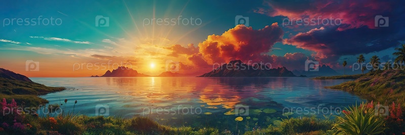 Панорамный восход солнца над летним озером, облака, отражения - фон летней карточки, широкая площадь для текста