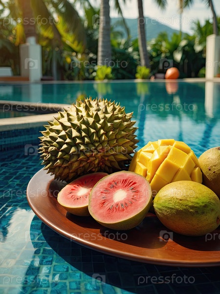 Ананас, арбуз, папайя тропическая тарелка ? летное курортное угощение, здоровое путешествие, реклама оздоровительного образа жизни, меню закусочного бара