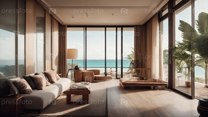 Современный курортный номер, окна от пола до потолка, мягкие натуральные тона - элегантная гостиница с видом на океан, роскошные путешествия и бутик-отель