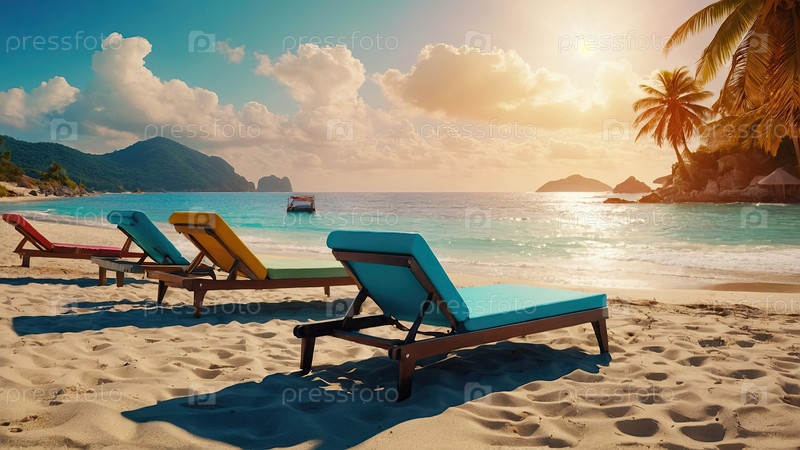 Два шезлонга на берегу океана, пальмы, закат - пляжный отдых, летнее расслабление, реклама путешествий, сайт отеля, туристический блог