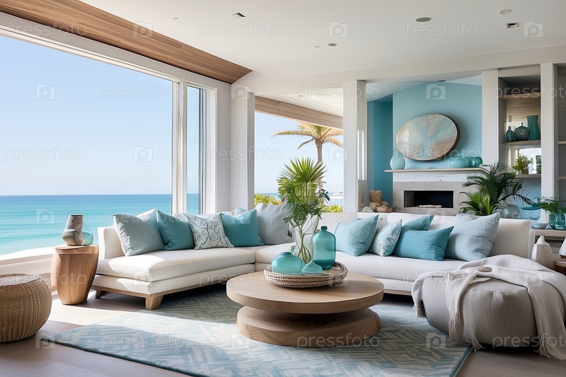 Отель на берегу моря в стиле скандинавского подражания с просторным открытым жилым помещением, бледной цветовой палитрой, панорамными окнами - стильное настроение пляжного отдыха, современное расслабление