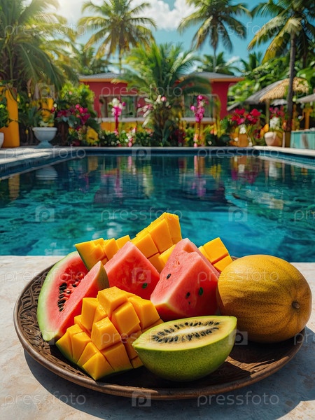 Тарелка с кубиком манго, арбузом, папайей, лаймом - гостиничный привет, летняя плодовая тарелка, здоровое меню для путешествий, объявление в баре бассейна