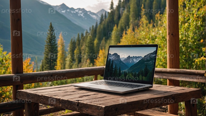 Ноутбук в горном эко-отеле, сосновая долина, свобода удаленной работы, летнее рабочее пространство, реклама туризма, зона Wi-Fi, отпускная работа