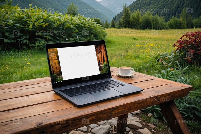 Ноутбук с пустым экраном, открытый стол, солнечный сосновый сад - место для текста, удаленная внештатная работа, Wi-Fi, творческое рабочее пространство, реклама отпуска