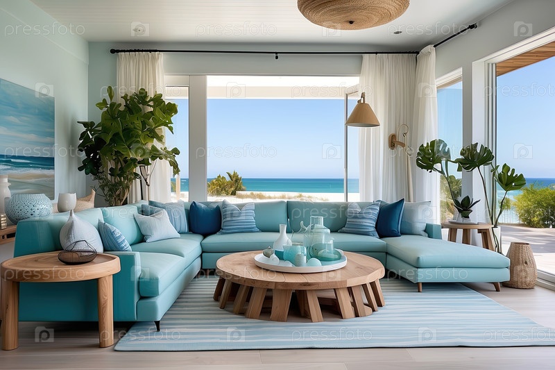 Минималистический гостиничный номер с деревянным полом, окнами полной длины, видом на океан - тихая прибрежная спальня, вдохновение для интерьера, расслабляющий отдых