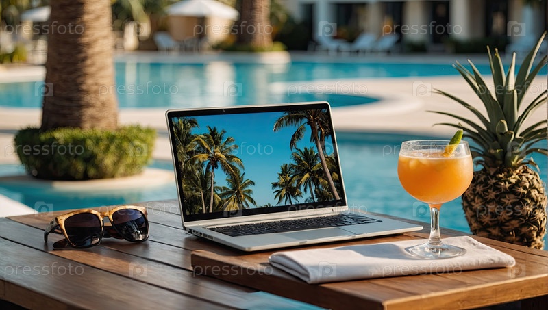 Ноутбук, апельсиновый сок, бар с пальмовым бассейном - рай для фрилансеров, тропическая рабочая зона Wi-Fi, творческие летние путешествия, цифровой кочевник, рекламный баннер