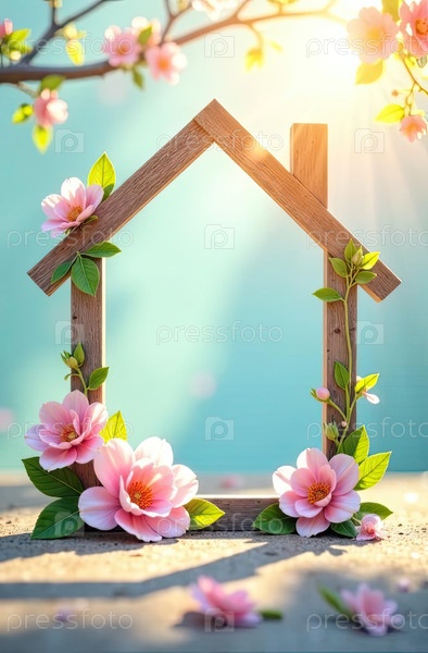 Весенняя рама в форме цветущего дома, приглашение на покупку дома, ипотеку или мероприятие открытых дверей