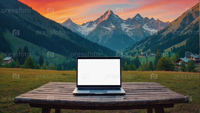 Ноутбук с пустым экраном, закатные горы, круглый стол на открытом воздухе? добавить текст, рекламный баннер для удаленной цифровой работы, путешествия по Wi-Fi