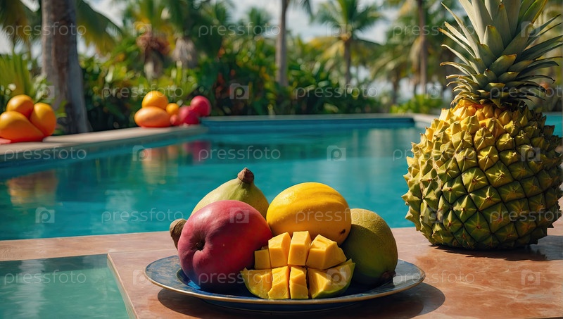 Манго, ананас, кусочки папайи на черной тарелке ? закуска в праздничном отеле, освежение в бассейне, промо-промо летней поездки, баннер питания направления
