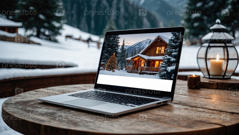 Горный завтрак и ноутбук - удаленная работа, чашка кофе, живописные сосны, цифровая работа на природе, утреннее рабочее место, путешествие Wi-Fi