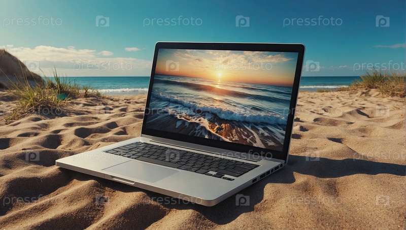 Крупный план ноутбука, белый песок, мягкие волны, закат - творческие путешествия удаленная работа, свобода фрилансеров, зона Wi-Fi, рабочее пространство морского ветра