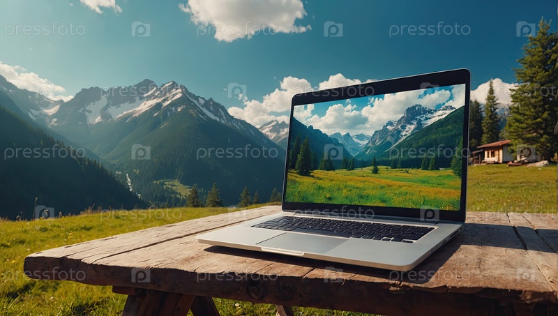 Ноутбук с горами, сельский дом, зеленое небо? свобода цифровой работы, летние командировки на работу, необходимый Wi-Fi, творческий рабочий уголок под открытым небом