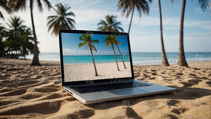 Ноутбук, кокосовый напиток, тень пальмы на песке? пляжный фриланс, летняя удаленная работа, доступ к Wi-Fi, свобода, цифровой номадский открытый стол