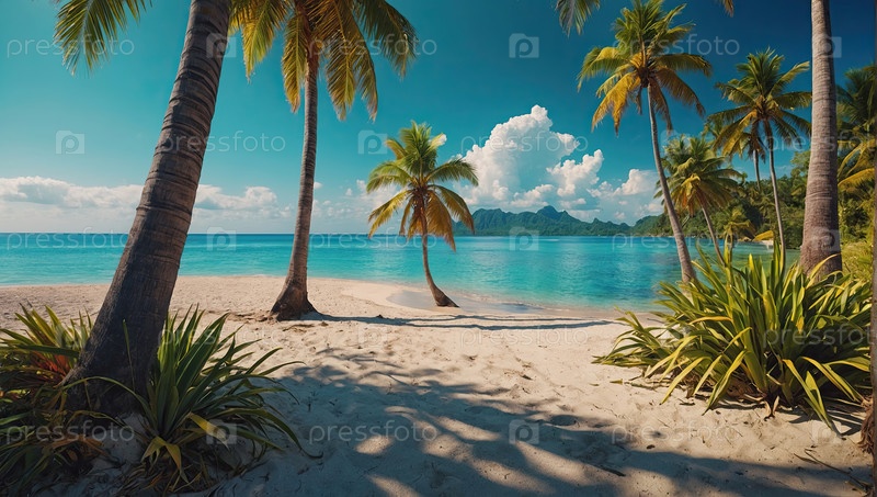 Пальмы на песке, голубая лагуна, солнечный пляж ? тропическое бегство, реклама отпуска, туризм, визуальный летний тур, вдохновение для путешествий