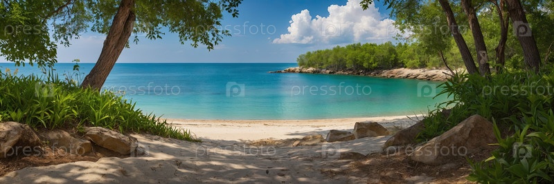 Тропический пляж, пальмы, спокойная голубая вода, яркое небо - горизонтальный летний фон, открытое пространство для текста или логотипа