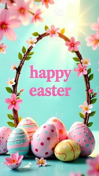 Вертикальная пасхальная открытка, надпись "Счастливая Пасха", пастельные яйца, весенняя цветочная рама, праздничный шаблон