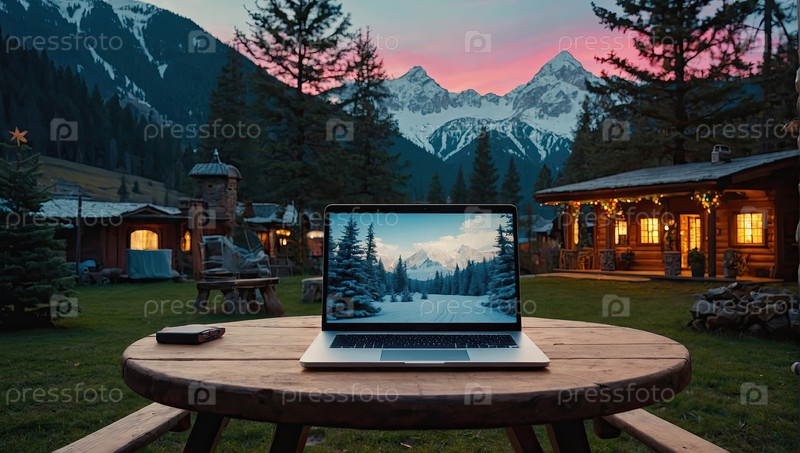 Ноутбук на веранде под свечами, сумерки в горах? удаленная работа, цифровая свобода, фрилансер, живописный вечер, Wi-Fi, творческое отступление