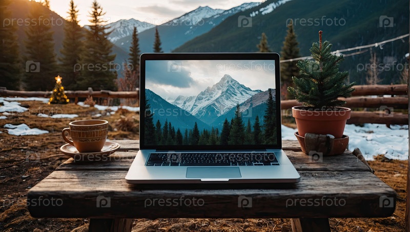 Ноутбук на деревянном столе, отражение восхода солнца в горах, синий кружок - вдохновляющее удаленное рабочее место, творческий фриланс, Wi-Fi жизнь, путешественник подарок