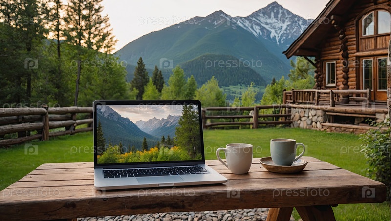 Ноутбук на деревянном столе в горной долине ? удаленная фриланс-работа, природа, путешествия, свобода, надежный Wi-Fi, весенний пейзаж