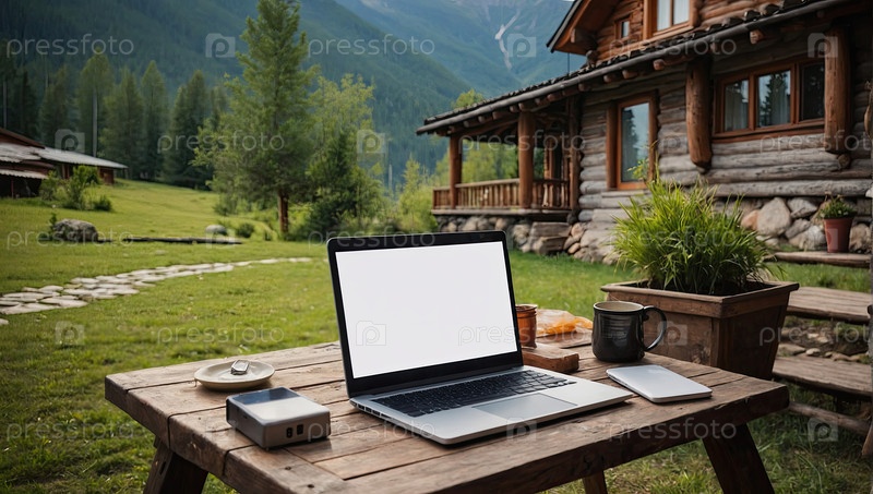 Ноутбук на солнечной деревянной палубе, горная летняя деревня, удаленная работа, природа, фриланс, путешествия, доступ к Wi-Fi, производительность под открытым небом