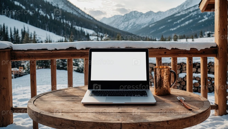 Круглый стол ноутбук, балкон бревенчатого дома, лесная гора ? эко рабочее пространство, зона для фрилансеров, летний зеленый цвет, реклама цифрового кочевника, баннер wifi