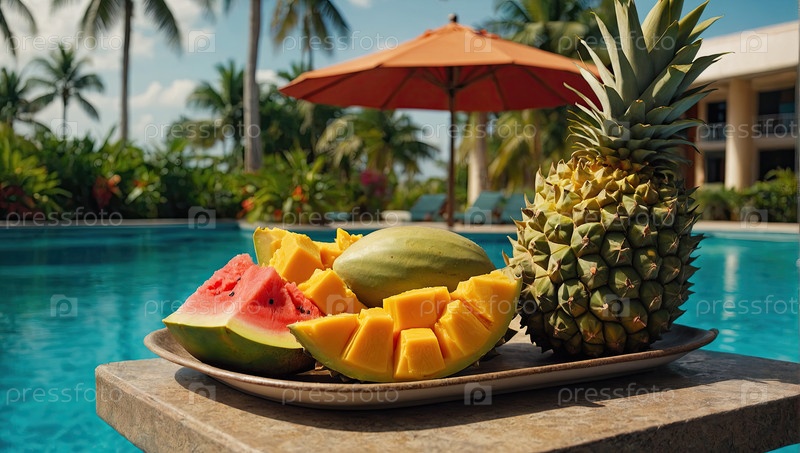 Ананас, кубики манго, арбуз на подносе ? плодовая тарелка гостеприимства, летняя еда, спа-завтрак, закуска в бассейне, угощение для гостей