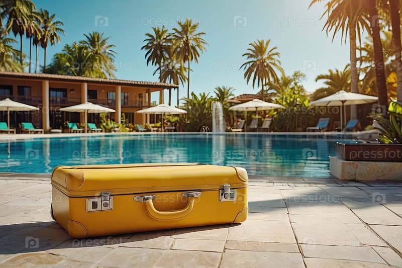 Желтый чемодан рядом с бассейном и пальмами? летние каникулы, вдохновение для путешествий, туризм, туристическое агентство, упаковка, социальные сети