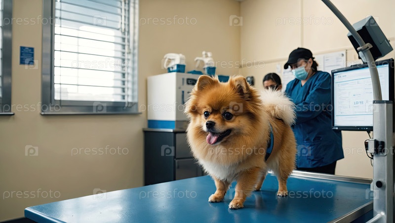 Померанский шпиц на столе в ветеринарной клинике ? медицинское обследование, осмотр питомца, спокойный или нервный, вакцинация, назначение