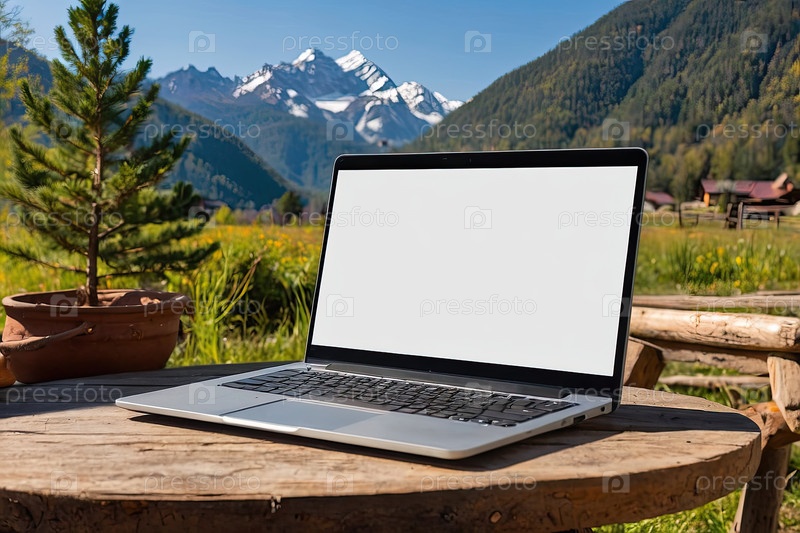 Пустой экран ноутбука, деревянная веранда коттеджа, сосновый лес - место для текста, фрилансеров, баннер Wi-Fi удаленной работы, эко рабочее пространство