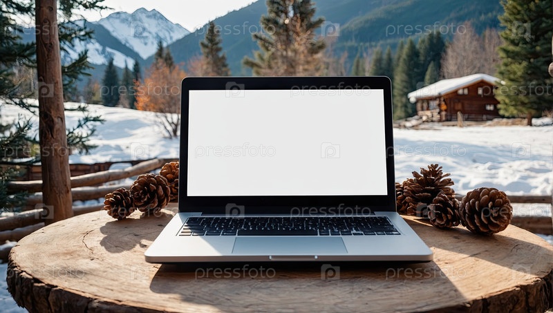 Ноутбук с пустым белым экраном, декор сосновой косточки, зимний деревянный стол - редактируемая текстовая область, цифровое удаленное рабочее пространство, праздничная реклама wifi