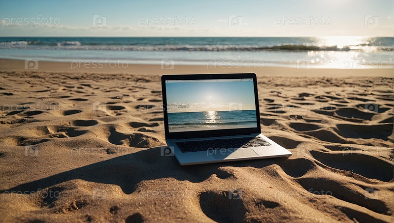 Ноутбук в песчаных дюнах, голубое небо, солнечные тропики? удаленная работа, пляжный фриланс, летнее рабочее пространство Wi-Fi, реклама путешествий цифрового кочевника