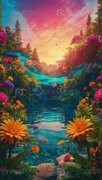 Вертикальная мечтательная летняя река с светящимся закатом, деревьями, эффектом акварели? путешественный коллаж, творческий шаблон (область для текста доступна)