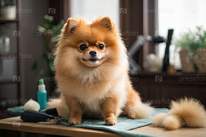 Помераньян сидит на столе ухода за собой - пушистая стрижка, чистка шерсти, уверенный питомец, внутренний декор, профессиональные салонные инструменты