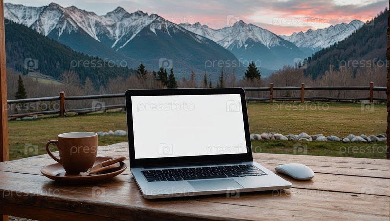 Ноутбук и чашка, солнечная горная палуба - работа по путешествиям, пустой экран, текстовая зона, свобода цифрового кочевника, рабочее пространство Wi-Fi, темный деревянный стол