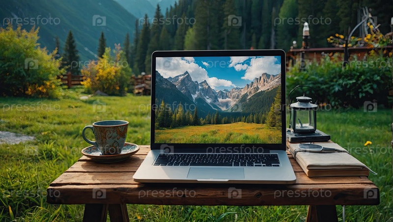 Ноутбук и утренний кофе в горах - удаленная фриланс-работа, эко-отступление, вид на сосновую долину, рабочее место с свежим воздухом, баннер Wi-Fi