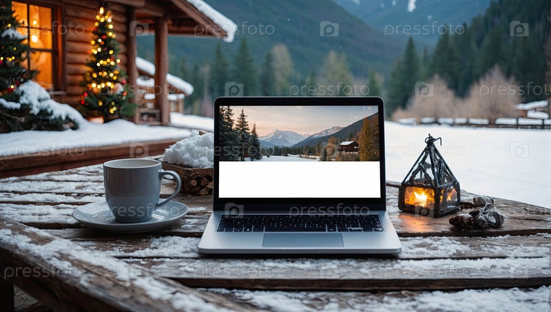 Ноутбук, фонарик, деревянный стол, заснеженная горнолыжная деревня - зимняя работа, удаленная цифровая работа, уютное рабочее пространство, нужны Wi-Fi, сумерки, фрилансер