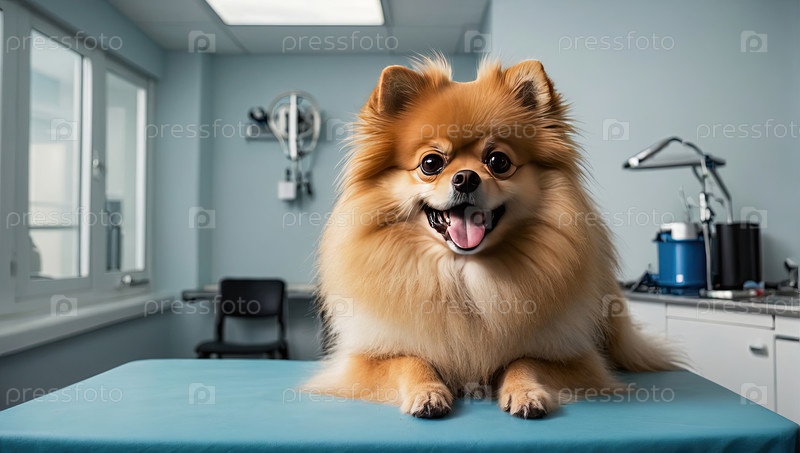 Собака на экзаменационном столе у ветеринара ? Помераньян, медицинский осмотр, скрининг щенка, отношение: спокойный, веселый или напуганный